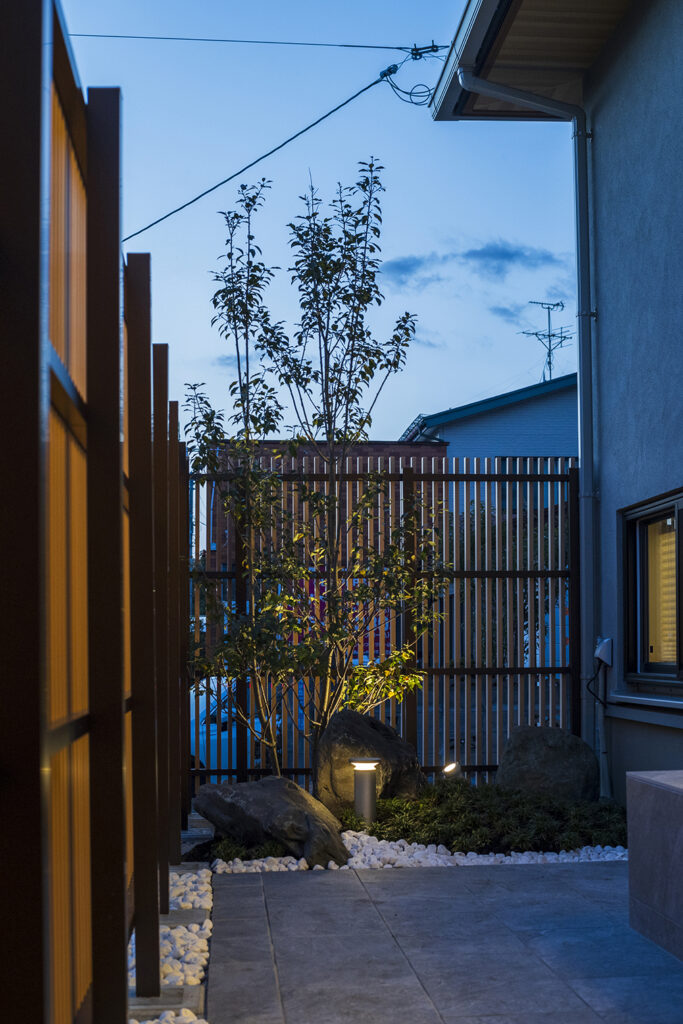 和室前の庭は、室内の地窓からも外からも楽しめるよう“和の庭園”のような落ち着いた趣を大切にしてデザインしました。