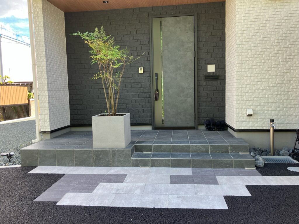 シンプルながらもスタイリッシュな印象に仕上げたアプローチは、お住まいの外観と調和するモノトーンカラーのタイルを採用。